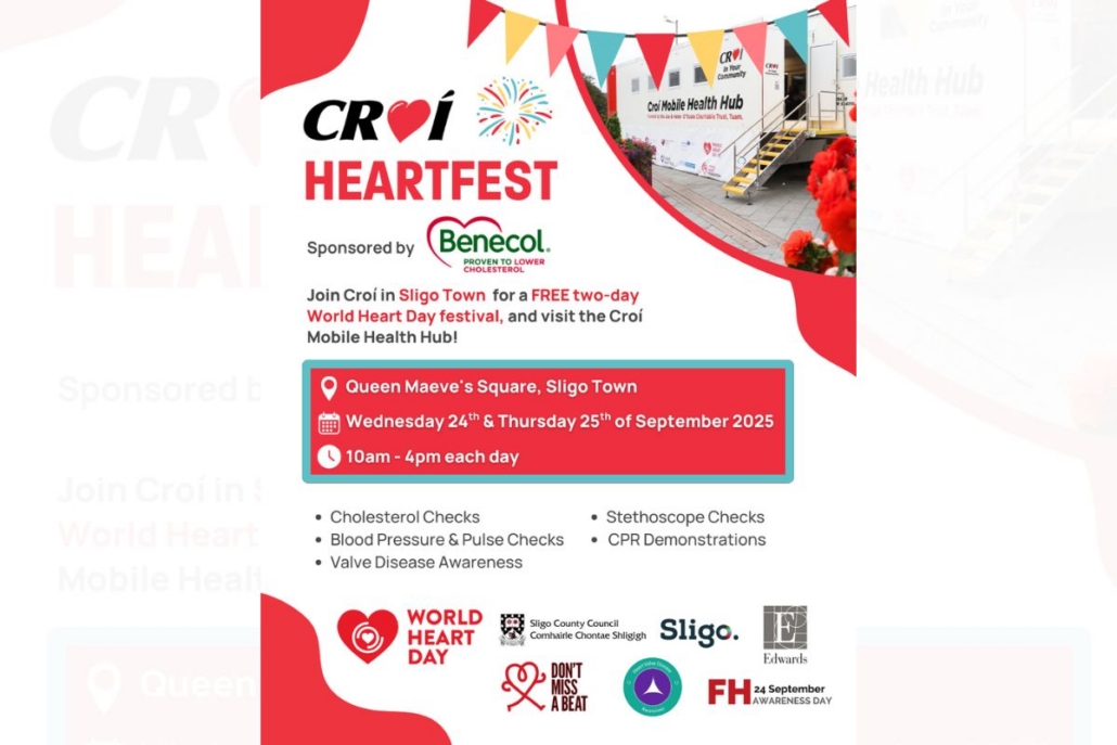 Croí invites everyone in Sligo and the surrounding areas to join them on Wednesday 24th and Thursday 25th September, from 10am to 4pm at Queen Maeve’s Square, to avail of free heart health checks and learn more about how small steps today can make a life-saving difference tomorrow.